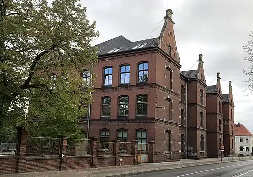 Der historistische dreigeschossige Backsteinbau entstand in den Jahren 1895/1896. Der Grundriss des langgestreckten Baus ist symmetrisch. Es bestehen vier Querhäuser, die im Abstand von jeweils drei Fensterachsen angeordnet sind.