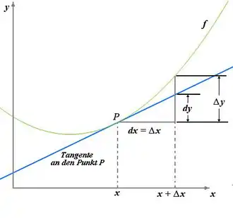 wobei die Ableitung von an der Stelle bezeichnet. Anstelle von schreibt man auch oder . Diese Beziehung lässt sich mit Hilfe partieller Ableitungen auf Funktionen mehrerer Variablen verallgemeinern und führt dann auf den Begriff des totalen Differentials.