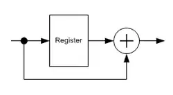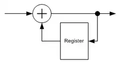 In den Gleichungen steht für die XOR-Verknüpfung oder modulo-2 Addition. Der Ausdruck drückt dabei den Umstand aus, dass zur Codierung und Decodierung der Zustand des vorherigen Wertes nötig ist. Schaltungstechnisch wird dies in Form eines Registers mit einem Bit Speichertiefe realisiert, wie in nebenstehenden Abbildungen dargestellt. Die Differenzcodierung stellt damit eine einfache rekursive Faltungscodierung mit dem Gedächtnis von einem Bit dar.