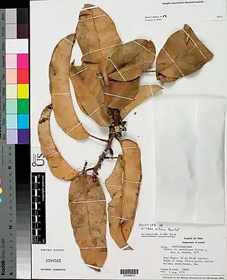 Die Laubblätter sind in Blattstiel und Blattspreite gegliedert. Der stielrunde Blattstiel ist 1,5 bis 3 Zentimeter lang und verfärbt sich beim Trocknen mit Ausnahme des unteren Drittels bis Hälfte des Pulvinus hellbraun. Dieser Teil des Pulvinus ist leicht verdickt und verfärbt sich schwarz. Die einfache, ledrige Blattspreite ist bei einer Länge von 8,5 und 19 Zentimeter und einer Breite von 5 und 6 Zentimeter annähernd eiförmig, wobei sich die breiteste Stelle nahe der Spreitenbasis befindet. Die Spreitenbasis ist gerundet und das obere Ende der Blattspreite ist spitz oder gerundet und kurz zugespitzt. Der Blattrand ist bei Herbarmaterial gewellt, dies wird möglicherweise durch die gekrümmte Mittelrippe verursacht. Die Blattspreite verfärbt sich beim Trocknen (Herbarmaterial) etwas glänzend hellbraun. Der gekrümmte Mittelnerv ist auf der Blattunterseite stark erhaben und von ihm gehen 12 bis 18 Paare an gut erkennbaren Seitennerven ab. Nebenblätter wurden vom Autor der Erstbeschreibung nicht gesehen, da sie am gesichteten Herbarmaterial nicht vorhanden sind.[1]
