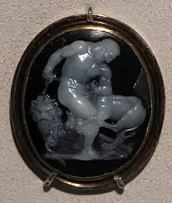 | Kamee | Sardonyx | Herkules fesselt Kerberos (Motiv nach rechts) | altgriechisch ΔΙΟϹΚΟΥΡΙΔΟΥ im Original rechtsläufig |