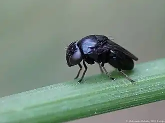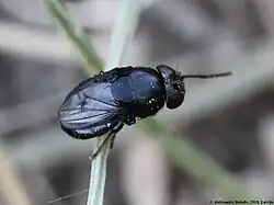 Die schwarzen Fliegen sind 2,5–3 mm lang. Lediglich die Tarsen sind rotbraun. Die Fliegen besitzen dunkle Flügel, die sie in Sitzhaltung über ihrem Hinterleib übereinander klappen.