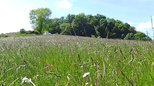 ![]() Blick zur Kuppe des Disibodenbergs mit dem Naturschutzgebiet (Wald) | ||
