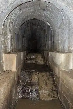 Um den Damm vor Durchnässung durch Oberflächen- und Quellwasser zu schützen und damit folgenschweren möglichen Hangrutschungen vorzubeugen, wurden an der Ostflanke des Dammes Entwässerungsstollen angelegt.