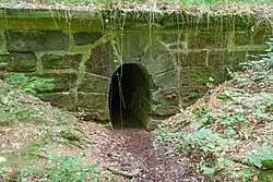 Aufgrund der tiefliegenden Talsohle konnte das Wasser des Tiefenbachs nicht in den Kanal abgeleitet werden. Zur Durchleitung wurde an der Talsohle ein großzügig dimensionierter Durchlass gebaut. Der Bachlauf wird dabei in Süd-Nord-Richtung auf einer Länge von etwa 180 Metern durch den Dammsockel geleitet. Der U-förmige Tunneldurchmesser misst im Schnitt etwa 2,30 mal 2 Meter. Die Portale sind aus Burgsandstein gebaut. Der Innenbereich ist vollständig und überwiegend mit Burgsandsteinquadern ausgekleidet. Rechtsseitig parallel zum Bach verläuft ein etwa einen Meter breiter Gehweg der für Revisionsarbeiten angelegt wurde. Im Inneren findet sich eine Einmeiselung mit der Jahreszahl 1877. Diese scheint aber neueren Datums zu sein und wurde wahrscheinlich bei der Restaurierung in den 1990ern erneuert. An der Decke und Wänden finden sich teilweise schöne und bunte Sinter- und Tropfsteinbildungen. Die rötlichen und bräunlichen Farbschläge verdanken sie den gelösten Eisenoxiden aus dem umgebenden Dogger.