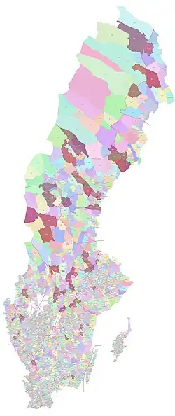 Die Einteilung Schwedens in statistische Distrikte entspricht der Einteilung in die 2523 församlingar (im Sinne der Volksbuchführung) der Schwedischen Kirche am 31. Dezember 1999.[1][2][3] Die Zugehörigkeit zu einer statistischen församling war unabhängig von einer Mitgliedschaft in der Schwedischen Kirche.