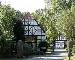 - Das Gut Ditterke war seit 1579 im Besitz von Jobst Knigge.[7] Teile dieser Hofanlage stammen aus dem Mittelalter.[2] Besonders erwähnenswert sind das Haupthaus im Nordteil der Anlage von 1794, eine Längsdurchfahrtscheune von 1802 und das Haupthaus von 1835 im Süden, das im 20. Jahrhundert mehrfach verändert wurde. Die Ziegel, aus dem die Bauten der früheren Brennerei entstanden, stammen aus einer im Süden Ditterkes im 19. Jahrhundert errichteten Ziegelei.[2] Auf diesem seit 1640 der Familie Garben gehörenden Bauernhof[25] werden Urkunden des Hofes und über den Hof aus der Zeit des Dreißigjährigen Krieges bis in die heutige Zeit aufbewahrt. Eine alte Türinschrift auf dem Hof lautet: Anno 1641 ist dieser Hof von schwedischem Kriegsvolk rein in den Grund eingeäschert.[26]