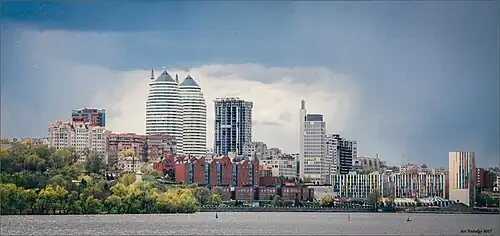 Im Stadtgebiet befinden sich mehrere Inseln und Halbinseln, die erwähnenswerteste ist die Klosterinsel.[7] Zwischen dem rechten Dneprufer und der Klosterinsel befindet sich der Bischof-Kanal, ein 1850 Meter langer Seitenarm des Dnepr.[8] Darüber hinaus befinden sich die Dneprinseln Grüne Insel ⊙ (ukr. зелений острів), die Schewski-Insel ⊙ (ukr. острів Шевський), die Olexijiwski-Insel ⊙ (ukr. Олексіївський острів) sowie die Nehrung Kosa ⊙ (ukr. Коса) und die Feinberg-Halbinsel ⊙ (ukr. Півострів Файнберга) im Stadtgebiet. Bis zur Errichtung des großen Staudamms bei Saporischschja stürzte der Dnepr südlich von Dnipro über zahlreiche Stromschnellen, die eine durchgehende Befahrung verhinderten und über Jahrhunderte ein Verkehrshindernis darstellten.