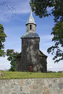Erwähnenswert ist die ehemals evangelische Kirche, die im 17. Jahrhundert erbaut wurde[22]. Die Fachwerkkirche in Pfahl- und Rahmenbauweise wurde 1745 renoviert.[1] Das Kirchenschiff ist auf einem länglichen achteckigen Grundriss gebaut. Das Fachwerk ist zurzeit verputzt. Ein vierseitiger Holzturm an der Vorderseite ist fast vollständig in das Kirchenschiff eingebettet. Der Turm ist mit einer achteckigen Zinnkuppel in Form eines umgekehrten Bechers gekrönt. Die Flagge auf der Turmspitze trägt das Datum 1701. Der barocke Hauptaltar stammt aus dem 18. Jahrhundert. Das neugotische Metallkruzifix stammt aus der zweiten Hälfte des 19. Jahrhunderts. Der Bau wurde 1946 von der katholischen Kirche übernommen und ist heute Johannes dem Täufer geweiht[23]. Als historisches Gebäude steht die Kirche unter der Registriernummer 230 seit 1960 auf der Denkmalliste[22].