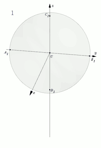 Gegeben sei eine Umkugel, z. B mit dem Radius gleich und deren Mittelpunkt . Beim Bestimmen der und Achsen eines kartesischen Koordinatensystems, entstehen die Punkte und auf der Oberfläche der Umkugel.