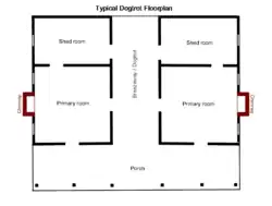 Das Dogtrot-Haus bestand früher aus zwei Blockhäusern unter einem gemeinsamen Dach mit einer dazwischenliegenden Passage (englisch dogtrot oder breezeway). Normalerweise wurde ein Blockhaus zum Kochen und Essen verwendet und das andere zum Schlafen. Es hat meist 1 bis 1½ Stockwerke und mindestens zwei Räume mit jeweils 5,5 bis 6 m Breite, die Türen zu der zentral gelegenen Passage haben. Gelegentlich sind weitere Räume oder Schuppen angebaut, die die Passage vorne oder hinten flankieren.[1][3] Die Passage bot durch die Überdachung Schutz vor der Hitze und eine natürliche Belüftung der danebengelegenen Räume.[5]