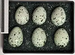 Die Eiablage findet von April bis Mai statt.[2] Das Gelege besteht aus zwei bis acht, in der Regel zwischen vier und sechs bläulichen Eiern, die dunkel gesprenkelt sind. Die mittlere Gelegegröße liegt im gesamten Verbreitungsgebiet stets bei etwa fünf Eiern. Das Weibchen bebrütet sie 16–20 Tage, während dieser Zeit wird es vom Männchen gefüttert. Die Nestlinge werden nach 28–41 Tagen flügge, die Dauer hängt unter anderem vom Nahrungsangebot und der Größe des Geleges ab. Nach dem Ausfliegen sind die jungen Dohlen noch etwa fünf Wochen lang von den Eltern abhängig. Der Bruterfolg ist bei spät brütenden Paaren geringer als bei frühen Brütern. Meist werden nicht mehr als ein oder zwei Jungen eines Geleges flügge. Kleinere Gelege mit zwei bis vier Eiern produzieren relativ am meisten Junge, in Gelegen von fünf Eiern werden absolut am meisten Nestlinge flügge. Aus fünften und weiteren Eiern schlüpfen am seltensten Junge. Falls doch, werden diese fast nie flügge.[30][31]