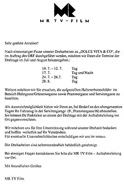 Die Restaurantszenen wurden ab Sommer 2000 in einer adaptierten ehemaligen Greißlerei in Wien-Alsergrund, Hahngasse 16, mit Lieferanten-Eingang in der Grünentorgasse 27 gedreht. Ein weiterer Drehort im Servitenviertel war ein gegenüber der Servitenkirche gelegenes Lokal, Standort: Grünentorgasse 19B.