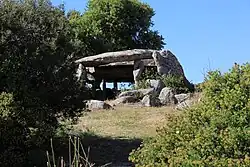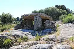 Der Dolmen Ladas stammt aus der Zeit um 3000 v. Chr. Er besteht aus einer großen überdachten Galerie, die 6 m lang und 2,2 m hoch ist. Er wird von zwei großen Platten bedeckt und hat eine hintere Apsis. Die Kammer wird durch eine horizontale Platte zweigeteilt. Er gehört zur Gattung der auf der Insel seltenen Ganggräber. Der hintere Deckstein hat eine Oberfläche von etwa 15 Quadratmetern und misst 4,8 × 3,4 m bei einer Dicke von 45 cm (7,5 m³). Die Unterseite ist anscheinend bearbeitet. Der Eingang ist 1,2 m hoch und 2,3 m breit.
