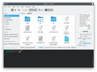 Für viele Funktionen greift Dolphin als Front-End auf KDE-Programmkomponenten, die KParts, zurück. Auch Archivinhalte oder entfernte Dateiverzeichnisse können über sogenannte kioslaves des KDE Input/Output bearbeitet werden. Dolphin erlaubt es, die Verzeichnisansicht zu teilen, um zwei Verzeichnisse nebeneinander darzustellen, und in einem Fenster mehrere Verzeichnisse in Tabs zu öffnen. Es können weiterhin Mehrfachumbenennungen von Dateien/Verzeichnisse durchgeführt werden und eine Rückgängig-Funktion wird geboten. Dolphin unterstützt sowohl die Brotkrümelnavigation als auch die direkte Eingabe eines Pfades.[8] Ähnlich wie in Krusader wird auch optional eine zweispaltige Ansicht angeboten.[9]