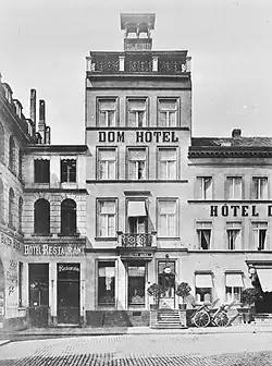 Am 29. September 1840 lud die Concert-Gesellschaft die Mitglieder der Musikalischen Gesellschaft, des Singvereins und der Liedertafel bei Herrn Harff auf dem Domhof zur Wahl der Direktion für die Winterkonzerte ein.[17] Das „Neue Kölner Adress-Buch von 1841“ verzeichnete ihn als Bewohner von Domhof Nr. 7 und Nr. 9.[18] Harff ließ das Gebäude 1841 erweitern. Am 1. Januar 1842 fand hier die erste Karnevalssitzung der neuen „Großen Karnevalsgesellschaft“ statt. Bekannt wurde es in der Kölner Bevölkerung insbesondere für seine Abonnementskonzerte. Am 3. März 1848 versammelten sich im „Saale Harff“ im Rahmen der Märzrevolution mindestens 500 Kölner Demokraten. Der glücklose Harff verkaufte 1857 die beiden Häuser an den Straßburger Ignatz Theodor Metz (* 1819), einem ehemaligen Restaurateur der Kölnischen Dampfschifffahrts-Gesellschaft. Metz ließ den Komplex umbauen und eröffnete hierin am 28. November 1857 das „Dom-Hotel“ („Hôtel du Dôme“).[19] Metz kaufte 1859 das südliche Nachbarhaus Nr. 5 (es war seit dem 14. April 1757 im Besitz des Perückenmeisters Franz Joseph Wilcken) hinzu, welches er 1860 durch einen Kaffeehausneubau („Café du Dôme“) ersetzte.[20] Dieser entwickelte sich zu einem Treffpunkt von Politikern, Künstlern und Literaten. Vor 1873 erwarb Metz auch Nr. 11 und integriert sie in den Hotelkomplex.[21]