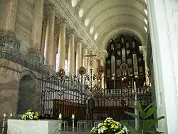 Fürstabt Martin Gerbert wählte 1771 den berühmten Straßburger Johann Andreas Silbermann aus, um eine der Kirche entsprechende Orgel zu bauen.[16] Den Entwurf für den Orgelprospekt zeichnete Pierre Michel d’Ixnard. Diese Silbermann-Orgel hatte 51 Register. Sie wurde 1807 im Zuge der Säkularisierung ausgebaut und 1813 durch Johann Ferdinand Balthasar Stieffell in die Karlsruher Stephanskirche versetzt, wo sie 1944 durch Bomben zerstört wurde. Auf der Balustrade vor der Orgel befinden sich noch zwei Puttengruppen des Bildhauers Joseph Hörr, die ehemals zur Silbermann-Orgel gehörten. Mit der Wiederaufnahme des abgetrennten Chores als Pfarrkirche wurde 1879 eine Orgel der Firma Voit und Söhne erbaut. Mit der Öffnung der Rotunde wurde diese Orgel zu klein und sie wurde 1913 nach Gailingen in die St.-Dionysius-Kirche veräußert.
