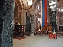 Für den Weiterbau mussten 16 Natursteinsäulen, jeweils 4 auf drei Seiten des Naos und nochmals vier in der Vorhalle im Westeingang besorgt werden. Nur die Ostseiten mit der Altarapsis sind ohne Säulen, innerhalb der Apsiswölbung waren jedoch noch 6 dekorative tordierte Säulen vorgesehen. Ohne die Einbringung der Säulen war ein vertikaler Weiterbau nicht möglich, eine Kommission wurde deshalb direkt in das Gebiet der Marmorsteinbrüche bei Carrara beordert. Die Kommission leiteten Nestorović, Deroko sowie zwei Fachleute der Steinmetzindustrie in Serbien.[60] Für Kapitelle der Säulen wurde weißer Carrara-Marmor aus 2000 m Meereshöhe beschafft, die Säulenschäfte kamen aus dem Montecatini-Steinbruch (Seula) in Baveno am Lago Maggiore. Insgesamt wurden 16 Einzelstücke für die Schäfte aus grünem Naturstein von Montecatini sowie 6 rote für die tordierten dekorativen Säulen des Altarraums beschafft. In Baveno wurden alle 16 großen Säulen von 8 m Höhe und 1 m Durchmesser auf Drehbänken, die noch mittels Wassermühlen betrieben wurden, abgedreht.[61] Nach ihrer Ankunft in Belgrad wurden sie zuerst statisch geprüft. Die Kapitelle der Säulen kamen in vorfabrizierten Blöcken mit den Säulen am 20. Januar 1940 an der Baustelle an. Kapitelle und Konsolen wurden zu ihrer Grundform ohne Ornamentik weiterverarbeitet. Josif Grassi, Professor für Angewandte Kunst an der Hochschule in Belgrad, übernahm die finale Ausformung. Nach Derokos 1:1-Zeichnungen fertigte er 4 Hauptvarianten für alle 16 großen Kapitelle und ebenso für die 6 kleinen. Vorarbeiten entstanden in Ton, die in Gips in natürlicher Größe abgegossen wurden. Nach diesen Modellen entstanden die finalen Marmor-Kapitelle durch Steinmetze. Da der Krieg im Frühjahr 1941 spürbar näher rückte, begann man die Säulen sofort durch Schutzbauten zu ummanteln. Sie wurden zuerst mit Stroh und Seilen bedeckt, danach um diese eine Ziegelmauer hochgezogen und in die Hohlräume Sand geschüttet.[62] Als es somit aussah, dass die Arbeiten an Dynamik gewannen und mit den 24 Marmorsäulen, 24 Kämpfer-Kapitellen und 6 Konsolen, die das Steinmetzunternehmen „Intramesion“ an die vorgesehenen Plätze verbracht hatte, sowie insgesamt 6 Konsolen und 9 Kapitelle nach Zeichnungen Derokos von Grassi beendet waren sowie selbst der Jablanica-Gabbro für den Sockel geliefert war, wurde die Baustelle für mehrere Jahrzehnte verlassen. Alle Säulen waren durch die Konservierung bis 1985 erhalten, jedoch konnten aufgrund entstandener Materialschäden nicht mehr alle in ihrer ursprünglichen Form weiterverwendet werden.