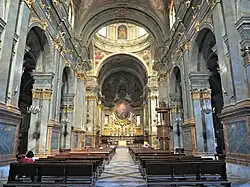 Der vom Architekten Mario Ludovico Quarini entworfene Dom besitzt eine imposante Fassade aus unverputzten Backsteinen in klassizistischem Stil, die durch die vier korinthischen Riesensäulen mit zusammengesetztem Kapitell beeindruckend gestaltet ist. Die dreischiffige Basilika mit schmale Seitenschiffen und Querschiff führt zu einem Chor mit runder Apsis. Die Deckengewölbe einschließlich der Vierungskuppel mit ihrem durchfensterten Tambour sind reich mit Fresken ausgemalt. Seitlich gehen zehn Kapellen ab. Bedeutende Bilder, darunter fünf Medaillons, stammen von Paolo Emilio. Weitere Gemälde wurden von Claret und Boetto gefertigt, die Fresken aus dem 19. Jahrhundert stammen von Luigi Hartman, Davide Ortori, Emilio Morgari und Domenico Mossello. Die Reliquien des Schutzheiligen der Stadt, des Heiligen Juvenal, werden ebenfalls im Inneren aufbewahrt.[2] 1985 wurde das Taufbecken von Quarini in die restaurierte Pfarrkapelle überführt, die an die Räumlichkeiten der Kathedrale angegliedert ist.[3]