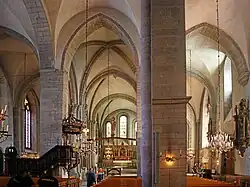 Kanzel mit Treppe; romanische und gotische Fenster -