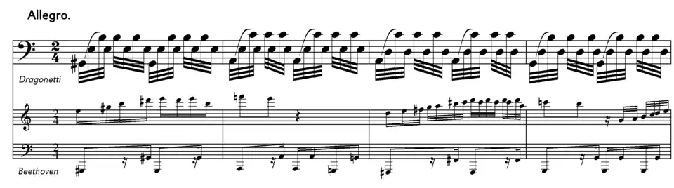 „Als ihn Dragonetti eines Morgens auf seinem Zimmer besuchte, sprach er den Wunsch aus, eine Sonate zu hören. Man ließ den Kontrabaß holen, und die Sonate Op. 5 Nr. 2[15] wurde gewählt. Beethoven spielte seine Partie, die Augen unverwandt auf seinen Mitspieler gerichtet; als aber im Finale die Arpeggios kamen, geriet er in eine so freudige Aufregung, daß er beim Schlusse aufsprang und Instrument und Spieler zugleich mit seinen Armen umschlang. Die unglücklichen Kontrabassisten in den Orchestern hatten während der nächsten paar Jahre häufig genug Gelegenheit, zu bemerken, daß diese neue Enthüllung über die Kräfte und Fähigkeiten ihres Instrumentes von Beethoven nicht vergessen worden war.“[16]