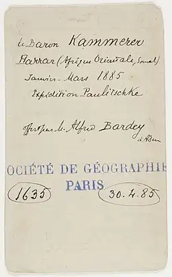 - ↑ Philipp Paulitschke (Hrsg.): Die geographische Erforschung der Adâl-Länder und Harâr’s in Ost-Afrika. Mit Rücksicht auf die Expedition des Dominik Kammel, Edlen von Hardegger. Veröffentlicht von Philipp Paulitschke, Paul Frohberg, Leipzig 1884, S. 6.