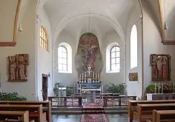 Die Ausstattung stammt zum Großteil aus der Zeit nach 1945. Das Wandfresko hinter dem Hochaltar zeigt die Himmelfahrt Mariens, es wurde 1949 von Hans Andre geschaffen.