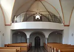 Innen wird das schlichte, einschiffige Langhaus von einer Stichkappentonne mit gekehlten Rippen über kräftigen Wandpfeilern mit Kämpfergesims überwölbt. Im Westen befindet sich eine mächtige, polygonal vorkragende Empore mit Orgel und Somcmerchor die vom Klostergebäude zugänglich ist. Der Triumphbogen ist rundbogig geschlossen, der eingezogene, einjochige Chor ist um zwei Stufen erhöht und mit einem Kreuzgratgewölbe über flacher Pilastergliederung versehen.