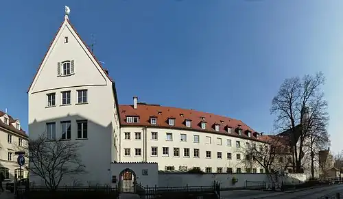 Das Kloster enthält eine Realschule. Es grenzt gegen Osten an die Augsburger Stadtmauer, von der hier noch ein ca. 100 m langes Stück erhalten ist. Unmittelbar vor dem Kloster teilt sich der Schwalllech in den Hinteren und den Mittleren Lech auf.
