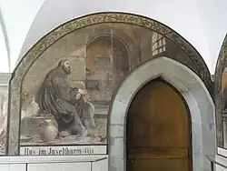 Der Stuttgarter Maler und Kunstprofessor Carl von Häberlin erhielt von der Familie von Zeppelin den Auftrag, den mittelalterlichen Kreuzgang des Klostergebäudes mit großformatigen Wandbildern aus der Geschichte der Insel zu gestalten und dabei die vorhandenen biblischen Fresken zu ersetzen. Häberlin arbeitete vom Frühjahr 1878 bis 1894, unterbrochen von den kalten Wintermonaten, an insgesamt 26 Bildern, die in chronologischer Reihenfolge Motive der Inselgeschichte von den Pfahlbauten der Frühgeschichte bis zu den ersten Hotelgästen zeigen. Einige der Bilder stellen historische Persönlichkeiten wie Karl den Großen, Maximilian I. und Kaiser Wilhelm II. bei Besuchen in Konstanz dar.[19]