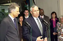 Während Chiracs zweiter Amtszeit als Präsident bekleidete Dominique de Villepin ab 7. Mai 2002 das Amt des Außenministers unter Premierminister Jean-Pierre Raffarin (Kabinette Raffarin I und II). Ab 2002 gehörte er der Union pour un mouvement populaire (UMP) an, die als Mitte-rechts-Sammelpartei aus dem RPR hervorgegangen war. Als Außenminister sprach sich de Villepin vehement gegen den Angriff der USA auf den Irak aus. Im Februar 2003 erhielt seine Rede im UN-Sicherheitsrat („Et c’est un vieux pays…“) – an diesem Ort ungewöhnlich – Applaus und weltweite Aufmerksamkeit.[2] Im Streit um das Atomprogramm des Iran schloss de Villepin im Oktober 2003 gemeinsam mit seinem britischen und deutschen Amtskollegen, Jack Straw und Joschka Fischer, in Teheran ein Abkommen mit dem Iran, in dem dieser sich strengeren Kontrollen der Internationalen Atomenergie-Organisation (IAEO) unterwarf.[3]
