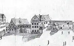 Links die Gustedtsche Kurie, rechts die Domdechanei auf einer Zeichnung aus der zweiten Hälfte des 17. Jahrhunderts