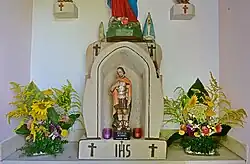 An der Stirnwand der Kapelle steht auf dem Altartisch in einer Ädikula, deren Basis die Inschrift IHS trägt, eine farbig gefasste Statue des heiligen Donatus von Münstereifel, gekleidet als römischer Soldat. Auf der Ädikula stehen drei weitere Figuren, eine Madonna mit der Schlange, flankiert von zwei kleinen von Privathand abgestellten Marienfigürchen, einer Lourdes- und einer Fatima-Madonna. Links und rechts über dem Altar sind zwei kleine Barockengel.
