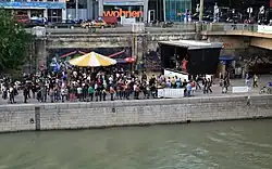 Aufgrund seiner zentralen Lage hat sich der Donaukanal in den letzten Jahren dank zahlreicher Infrastrukturprojekte vermehrt zu einem Freizeit- und Erholungsraum entwickelt. So hat sich 1995 auf dem Vorkai beim Ringturm das Musiklokal „Flex“ und bei der U-Bahn-Station Roßauer Lände 1996 die „Summer Stage“ mit Freiluftausstellungen und -konzerten sowie Gastronomiebetrieben etabliert. 2005 sperrte die "Strandbar Herrmann" auf. Nach 2006 wurde bei der Urania das „Badeschiff“ mit Schwimmbecken und Café-Restaurant in Betrieb genommen. Auch in der benachbarten, 2010 eröffneten „Schiffstation City“, der Anlegestelle des Twin City Liners, wird im „Motto am Fluss“ Gastronomie geboten.[5] An der Einmündung des Wienflusses befindet sich seit 2005 die „Strandbar Herrmann“ mit einem aufgeschütteten Sandstrand. Dem „Flex“ gegenüber besteht seit 2009 der sommerliche „Tel Aviv Beach“. Mehrere jährliche Musikfestivals bieten in den Sommermonaten bis in den Herbst entlang des Donaukanals Konzerte. Seit 2007 findet auf dafür auf den Uferpromenaden errichteten Bühnen und in mehreren Lokalen bei freiem Eintritt das Donaukanaltreiben statt.[6] Im Rahmen des erstmals 2011 veranstalteten Club-Festivals Waves Vienna spielen Bands auf mehreren Booten, darunter im Laderaum des „Badeschiffs“, sowie im „Flex“ und das Jazz Fest Wien hat Konzerte auf der „Summer Stage“ im Programm.