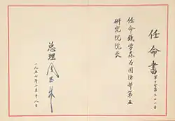 Entsprechend den Empfehlungen von Qian Xuesen und Nie Rongzhen richtete Verteidigungsminister Peng Dehuai am 6. August 1956 an seinem Amtssitz im Drei-Ehrentore-Gebäude das sogenannte „Fünfte Büro“ (第五局) ein. Leiter des Büros wurde Zhong Fuxiang (钟夫翔, 1911–1992), bis dahin Rektor der Universität für Post- und Fernmeldewesen Peking, sein Stellvertreter und Chefingenieur wurde Qian Xuesen. Als eigentliches Forschungsinstitut für Raketen und Kernwaffen – man beabsichtigte von Anfang an, die Raketen mit nuklearen Sprengköpfen zu versehen – wurde am 8. Oktober 1956 das „5. Forschungsinstitut des Verteidigungsministeriums“ (国防部第五研究院) gegründet,[5] das auf der Basis einer von Zhou Enlai unterzeichneten Anordnung des Staatsrats der Volksrepublik China vom 18. Februar 1957 am 1. März 1957 das Personal des Fünften Büros übernahm.[4] Qian Xuesen wurde zum Leiter des Instituts ernannt[6] und unterrichtete dort zunächst 100 Abiturienten und 156 Hochschulabgänger in den Grundlagen des Raketenbaus. Zhuang Fenggan (庄逢甘, 1925–2010), der am California Institute of Technology unter Frank E. Marble Luftfahrttechnik studiert hatte und Qian Xuesen aus jener Zeit kannte, unterrichtete Aerodynamik.