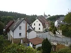 - Haus Nr. 26: Zweigeschossiger verputzter Massivbau; Erdgeschoss zweite Hälfte des 17. Jahrhunderts, darüber wohl Mitte 18. Jahrhundert, drei zu fünf Obergeschossfenster, im Erdgeschoss Fensterwände gekehlt. Geohrte Portalrahmung am Sturz bezeichnet „1750“.[20]
