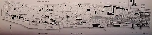 - ↑ Bereits im 17. Jahrhundert unterhielten reiche Kaufleute aus Hamburg in Neumühlen, Ottensen und Othmarschen Landhäuser und „Lustgärten“. Im Besonderen waren dies eingewanderte Niederländer und portugiesische Juden, die aus ihrer Heimat gewohnt waren, in den Sommermonaten in Landhäusern mit gepflegten Gärten zu leben: Wilhelm Volckens: Die Landhäuser der Flottbeker Chaussee auf Othmarschener und Övelgönner Gebiet im 19. Jahrhundert. In: Mitteilungen des Vereins für hamburgische Geschichte. Band 39, Nr. 1919. W. Mauke Söhne, 1920, S. [7] 200–201 (online).