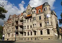 Das mit aufwändigen Sandsteinfassaden gestaltete viergeschossige Gebäude wurde 1904 für den Bauunternehmer Robert Paul Rischke erbaut. Der Altbau hat den Krieg unbeschädigt überstanden.[1]