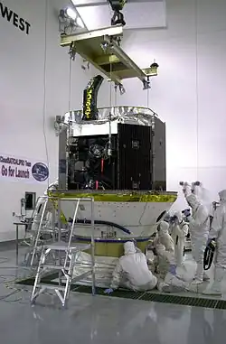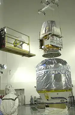 Der obere Satellit wird auf die Doppelstartvorrichtung einer Delta II gehoben.