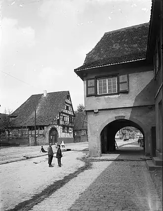 Am heutigen Tolnaplatz knickte die Dorfbach nach rechts und Norden ab () und folgte auf gut einen Kilometer der Hauptstraße des straßendorfartigen[4] Blankenlochs. In der Straße war das trapezförmige Gerinne rund 80 Zentimeter breit und etwa 40 Zentimeter tief; an Grundstückszufahrten wurde der Bach mit gusseisernen Platten überbrückt. In Höhe der heutigen Wiesenstraße () lag eine Pferdeschwemme, die 1912 aus hygienischen Gründen beseitigt wurde. Am heutigen Lindenplatz () verließ die Dorfbach die Hauptstraße und mündete nach wenigen Metern von links in die Alte Bach.