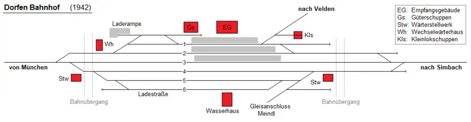 Nach den Ausbaumaßnahmen 1898 und 1901 gab es in Dorfen vier Hauptgleise, von denen drei mit Bahnsteigen ausgestattet waren. Das Streckengleis der Lokalbahn zweigte im Osten des Bahnhofs in einem engen Gleisbogen von Gleis 1 ab; das nach Osten weiterführende Stumpfgleis war mit einem Umfahrgleis ausgestattet. Ortsgüteranlage und Freiladegleis waren nun beidseitig angebunden. Mit den Erweiterungen der 1930er Jahre erreichten die Gleisanlagen des Bahnhofs Dorfen ihre größte Ausdehnung: Zwischen dem Empfangsgebäude und dem Wasserhaus lagen nun sechs beidseitig angebundene Gleise. Gleis 1 diente den Zügen der Lokalbahn nach Velden, die Gleise 2 bis 4 dem Zugverkehr der Hauptbahn, Gleis 5 der Bildung und Auflösung von Nahgüterzügen und das neue Gleis 6 als Freiladegleis.[12]