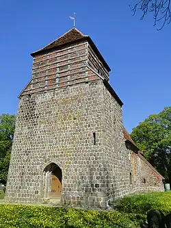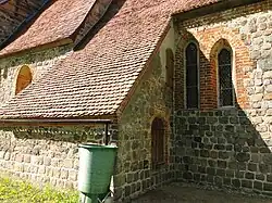 Das Bauwerk wird von spitzbogigen Lanzettfenstern erhellt, die teils unter Verwendung von Backstein vergrößert wurden. An der Nord- und Südseite des Schiffs finden sich noch romanisch anmutende Biforienblenden im Mauerwerk. Portale im Norden und Westen erschließen das Bauwerk; im nördlichen Portal ist noch eine Tür mit Eisenbeschlägen aus dem 14. /15. Jahrhundert erhalten. Die tonnengewölbte Sakristei ist an der Südseite des Chors angebaut. Der Chor ist mit Kreuzgratgewölbe, das Schiff mit Kreuzrippengewölbe abgeschlossen. Der Ostgiebel aus Backstein zeigt ein ausgespartes Kreuz, das von Blenden gerahmt ist. Der Turm erhielt im 18. Jahrhundert einen quadratischen Abschluss aus Fachwerk mit Pyramidendach und einer Wetterfahne von 1793.