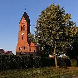 Die Kirche ist ein neuromanischer Backsteinbau mit Rechteckchor und Westturm und stammt aus dem Jahr 1901. Der im Innern der Kirche befindliche Schnitzaltar wird auf die Zeit um 1430 datiert. Im Schrein des Altars sind Maria mit Kind, begleitet von Katharina und Nikolaus dargestellt. In den Flügeln sind Petrus und Barbara zu sehen. Aus einer Erneuerung Anfang des 16. Jahrhunderts stammt das Schleierwerk des Schreins, die gemalte Verkündigung an den Außenseiten der Flügel und eine geschnitzte Kreuzigungsgruppe. Die Predella ist neu. Der Chor ist kreuzgratgewölbt, der Saal hat einen offenen verbretterten Dachstuhl. Die Bronzeglocke der Kirche ist aus dem Jahr 1673.[1]