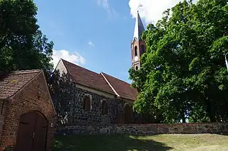 Das Bauwerk entstand im Wesentlichen aus Feldsteinen, die unbehauen und nicht lagig geschichtet wurden. Bei Ausbesserungs- und Umbauarbeiten kam in der Regel rötlicher Mauerstein zum Einsatz. Der Chor ist gerade und leicht eingezogen. An der Ostseite sind die Reste eines zugesetzten, mittig angeordneten Spitzbogenfensters zu erkennen. Reste einer möglichen Dreifenstergruppe sind nicht zu erkennen. Im Giebel ist eine schmale und hochrechteckige Öffnung. An der Nord- und Südseite sind je zwei spitzbogenförmige Fenster, deren Gewände aus Mauersteinen errichtet wurde. Im westlichen Bereich der Nordseite sind die Reste einer zugesetzten Pforte erkennbar. Am Übergang zur Dachtraufe befindet sich ein breiter, verputzter Streifen; darüber ein schlichtes Satteldach. Dieser kleine Rechtecksaal war demnach im 14. Jahrhundert der Sakralbau.