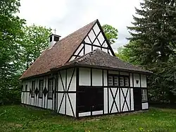 Das Bauwerk entstand im Wesentlichen aus Fachwerk, wobei das Gefach aus Mauersteinen errichtet wurde, die anschließend hell verputzt wurden. Der Chor ist rechteckig und besitzt an seiner Nordostseite eine rechteckige Pforte. An der Südostseite ist eine doppelflügelige Tür; mittig vier hochgesetzte, hochrechteckige Fenster.