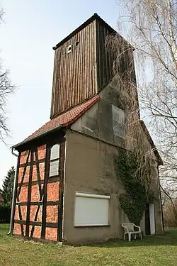Der Kirchturm besteht aus Fachwerk und ist fensterlos, sein Giebel ebenfalls verbrettert. Oberhalb erhebt sich ein verbretterter Turmhelm, der mit einem Pyramidendach abschließt.