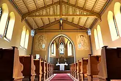 Innen schließt das Bauwerk mit einem offenen Dachstuhl, in der Apsis mit Fünfachtelschluss ist ein Rippengewölbe auf Konsolen eingezogen. Reste von figürlicher Wandbemalung aus der Bauzeit sind auf der Ostwand des Schiffs erhalten.