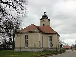 Die Kirche liegt leicht erhöht auf dem Anger des Dorfes und wurde als verputzter Zentralbau in den Jahren 1756/1757 über kreuzförmigem Grundriss erbaut. Die Patronatsherren waren zu dieser Zeit die von Zieten, nach 1775 unterstand die Kirche der Krone mit dem Kompatronat derer von Zieten. Sie wird von einem dreifach abgesetzten, wirkungsvoll gegliederten Westturm mit einer niedrigen Schweifhaube akzentuiert und ist von Walmdächern gedeckt. Die drei Portale sind mit geschwungenen Verdachungen versehen, das Bauwerk wird von hohen Sprossenfenstern mit Stichbogen und Schlussstein erhellt. Der hölzerne Vorgängerbau von 1643 wurde 1755 abgebrochen. Die heutige Kirche wurde 1898 durch Theodor Prüfer restauriert, wobei die Ostempore in den Westen versetzt, eine Sakristei eingerichtet und das Bauwerk neu ausgemalt wurde. Im Jahr 1944 wurden durch Bomben die Kirchenfenster zerstört.