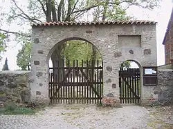 Die im Stil der Romanik um 1140 errichtete Feldsteinkirche steht auf einer westlich der Dorfstraße gelegenen Höhe, umgeben von einem Friedhof. Einem Saalbau sind im Osten Chor und Apsis und an der Westseite ein massig wirkender Querturm angefügt (Vollständige Anlage). Der in seinem Mauerwerk Risse aufweisende Turm wird von Norden und Westen durch äußere schwere Strebepfeiler gestützt. Das wahrscheinlich später aufgesetzte Glockengeschoss ist mit rundbogigen Schallöffnungen versehen, die zum Teil ganz oder nur im unteren Drittel vermauert sind. Der Turm wird durch ein Walmdach bekrönt. Das fensterlose Erdgeschoss des Turms ist weder von außen noch von innen zugänglich. In der Westwand des ersten Turm-Obergeschosses ist eine jedoch vermauerte Eingangstür zu erkennen. Im Inneren ist an der Tür noch die Sperrbalkenvorrichtung zu erkennen. Heute ist der Turm durch ein Rundbogenportal von der Orgelempore zu erreichen.