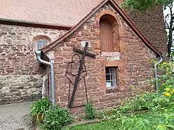 An der Kirchenmauer und im Eingangsbereich sind barocke Grabsteine aufgestellt.